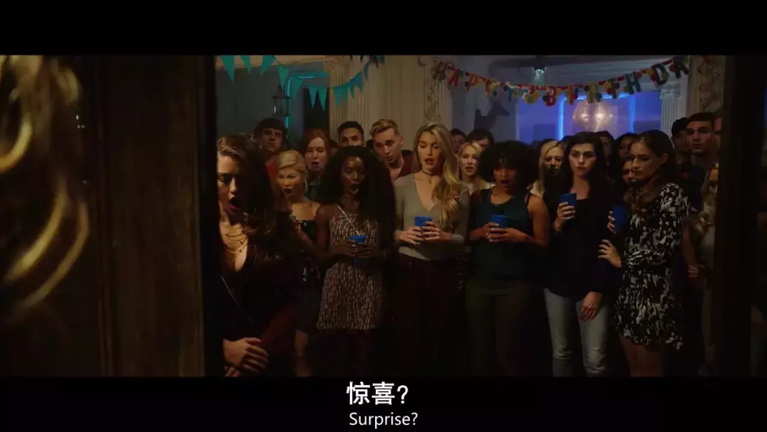 女主角反应迅速,一拳把面具人打倒,但灯突然亮起来了,原来是朋友们为她准备的生日惊喜派对。