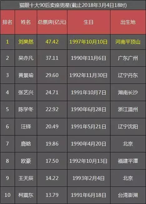 前几天,猫眼公布了一个十大90后卖座男星,直到2018年的大年初一,才在影院上映演艺生涯的第一部电影的黄景瑜排在了第三名。