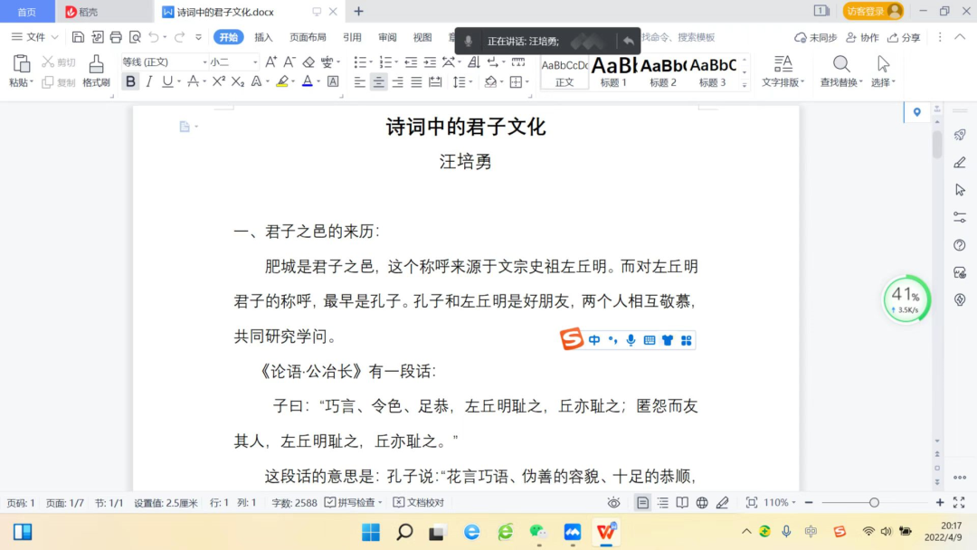 2、副会长汪培勇做了《诗词中的君子文化》的讲座。
