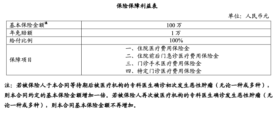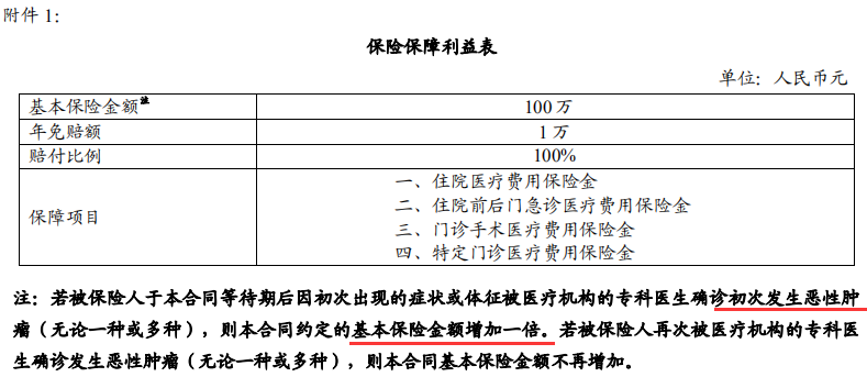 - 若被保人初次确诊恶性肿瘤,合同约定的基本保额增加一倍;
