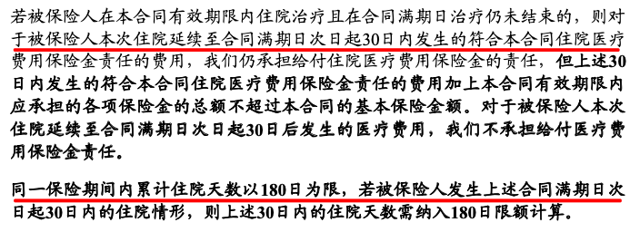 - 同一保险期内累计住院不超过180天,延长治疗的30天也包含在这180天内。