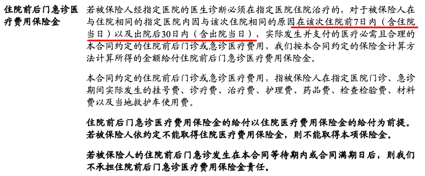 - 住院前7天和出院后30天产生的门急诊治疗费用给予报销;