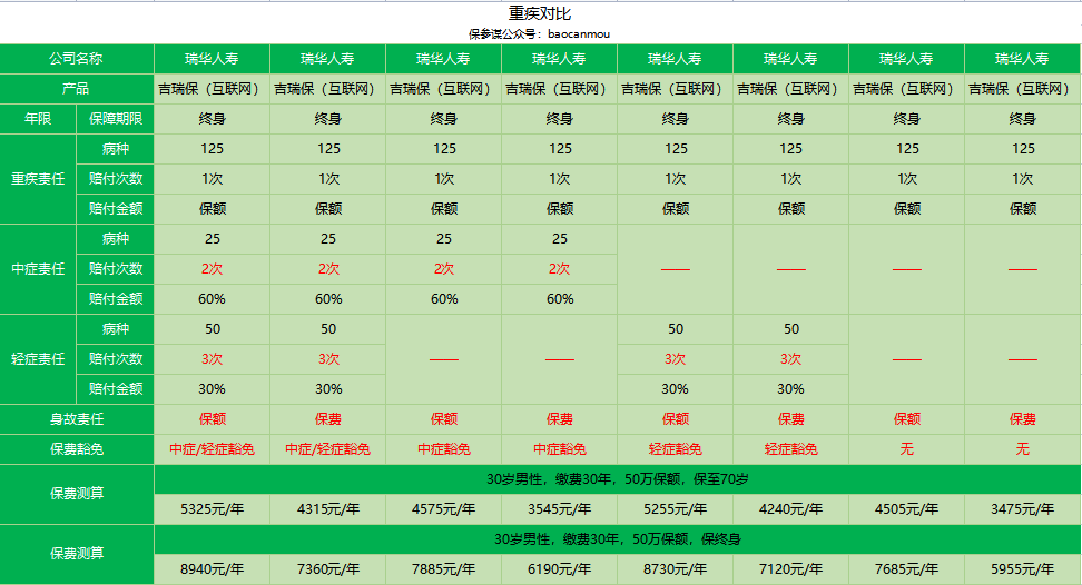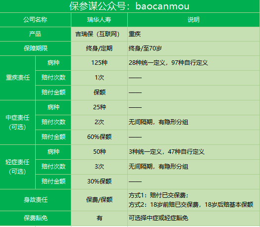今天测评的产品为:瑞华吉瑞保重疾险,合同名称为瑞华吉瑞保重疾险。这是一款自带身故责任,轻症、中症可选的重疾险,与此前瑞华推出的新瑞保类似。