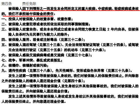 - 身故/重疾只能赔其中之一,下面是这款产品的身故免责条款,共9项:
