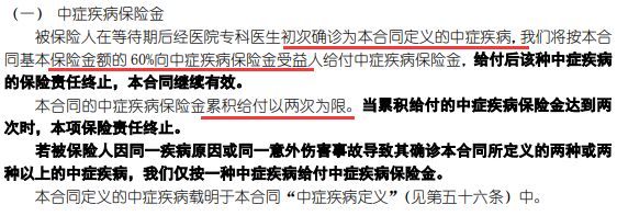 - 中症25种,赔付2次,每次赔付60%基本保额;