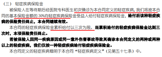 轻症(可选):50种,赔付3次,赔付30%保额