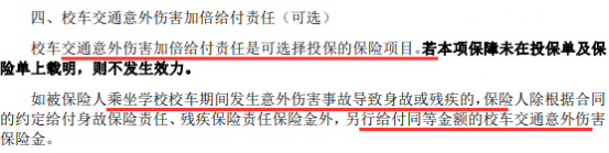 2-被保人乘坐校车期间发生意外导致身故或伤残的,除赔付意外身故/伤残保险金外,可另行赔付同等金额的校车交通意外伤害保险金。