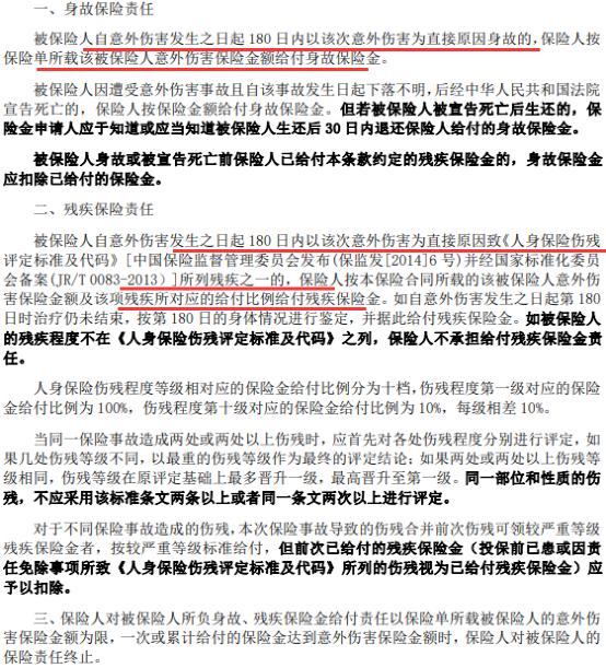 1-被保人因意外伤害事故,且在180天内导致身故/伤残赔付;