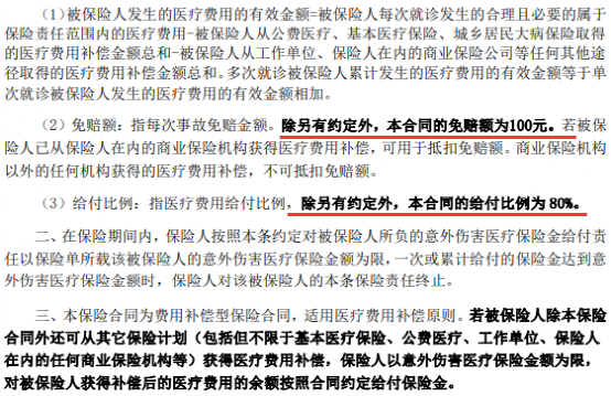 3-意外医疗免赔额0元,报销比例100%,限社保范围内。