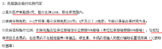 1-疾病住院医疗费用免赔额为:0-3岁投保每次住院免赔300元,4岁及以上0免赔;