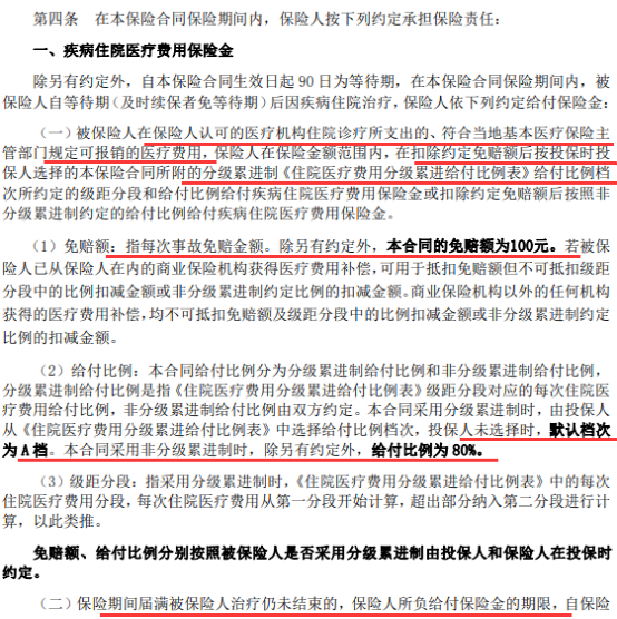 1-等待期后,被保人因疾病发生住院治疗的,按合同所附的《住院医疗费用分级累进给付比例表》报销住院医疗费用;