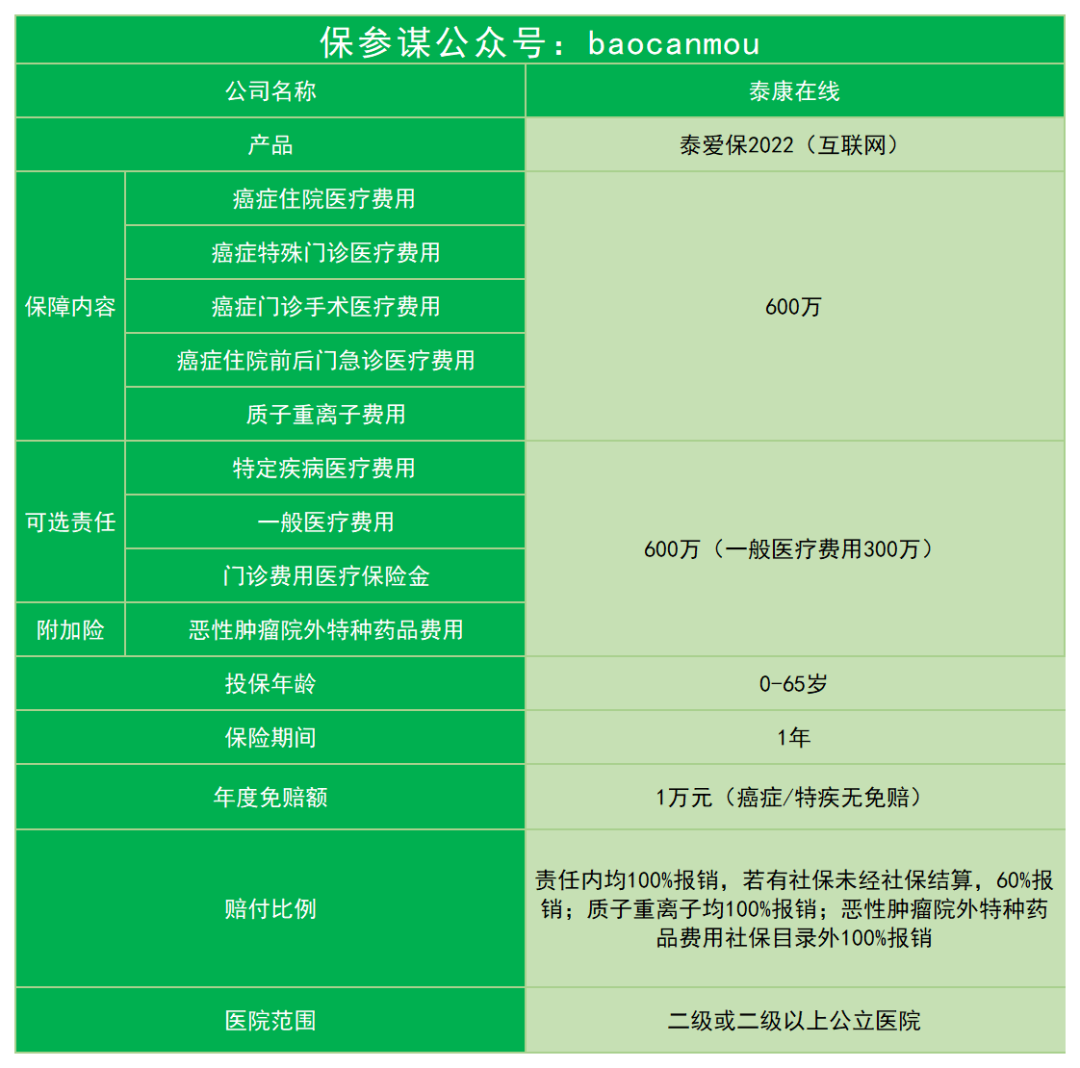 今天测评的产品为:泰爱保2022,这款产品是泰康在线推出的一款百万医疗险,最高可支持65岁人群投保,保障期1年,保额高达600万,覆盖了癌症医疗保险金和质子重离子医疗保险金基本责任,还有可选的特定疾病医疗、一般医疗、门诊费用医疗等责任。