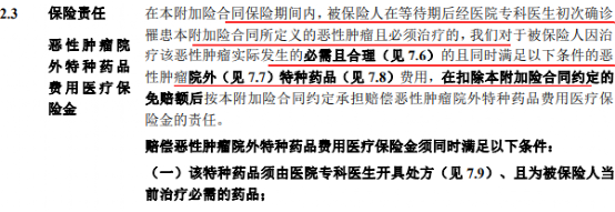 2-在附加险合同保险期间内,被保险人初次确诊罹患恶性肿瘤且必须治疗的,因治疗该恶性肿瘤实际发生的必需且合理的院外特种药品费用予以报销;