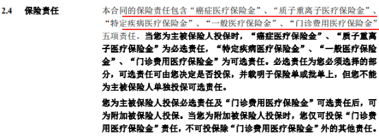 1-这款产品的必选责任:包括癌症医疗保险金和质子重离子医疗保险金;可选责任包括特定疾病医疗保险金、一般医疗保险金、门诊费用医疗保险金等;