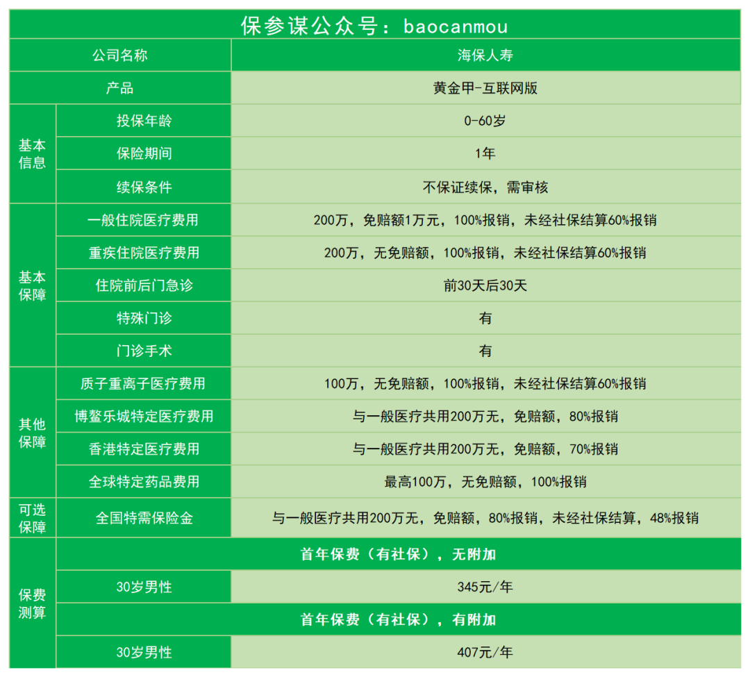 今天测评的产品为:海保人寿黄金甲医疗保险。这款产品是一款重疾医疗+特色跨境医疗的医疗保险,除了一般医疗、重疾医疗外,还包含香港特定医疗、全国特需医疗、博鳌乐城特定医疗、全球特定药品费用等。