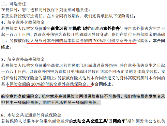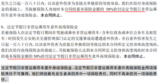 2-其中航空意外身故/高残额外赔付200%基本保额,水陆公共交通意外身故/高残额外赔付100%基本保额,法定节假日非营用乘用车意外身故/高残额外赔付50%基本保额;