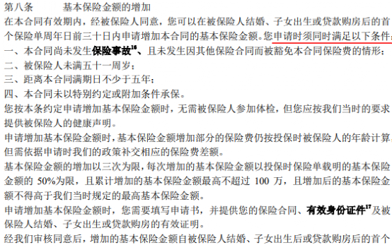 2-每次增加的保险金额以投保时基本保额的50%为限,累计增加的基本保额最高不超过100万。