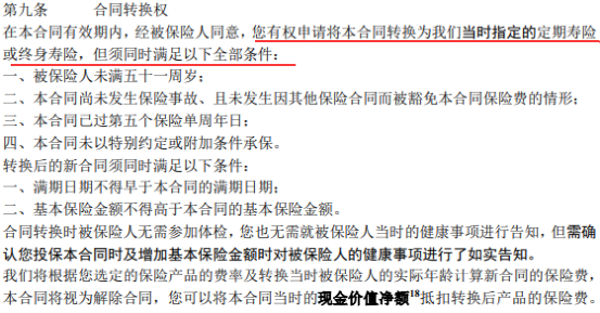 1-保险期内未出险,未发生其他保险的豁免,投保满第5年后,且被保人年满51岁前,可以申请转换为指定的定寿或终身寿险;