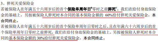 2-如果被保人在56岁前猝死,除赔付100%身故保险金外,还额外赔付60%猝死关爱保险金;