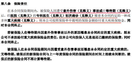 点评:被保人初次确诊合同约定的重大疾病,按照约定的保险金额赔付重疾保险金。同样,版本不一样,重疾保险金额度也不一样。