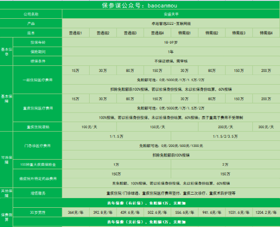 今天测评的产品为:安盛天平卓越馨选2022版医疗保险。这款产品有八个版本可选,其中普通版本4个,特需版本4个,保障责任都包含基础责任和可选责任,保额不同。如果你想投保特需版,那么这款产品可以看看。如果是想投保普通版,这款产品的竞争优势不算特别的明显。