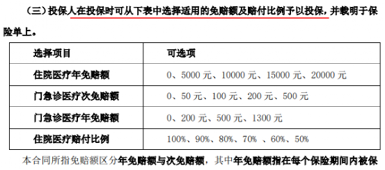 1-这款产品的免赔额是可以选择的,其中住院医疗可选0/5千/1万/1.5万/2万,门急诊医疗免赔额可选0/2百/5百/1.3千,非常的灵活;