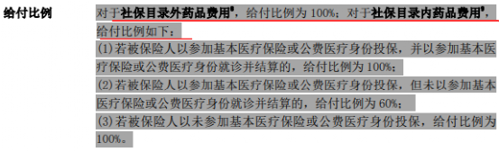 2-社保外药品100%报销;社保内药品,无社保100%报销,经社保结算100%报销,未经社保结算60%报销;