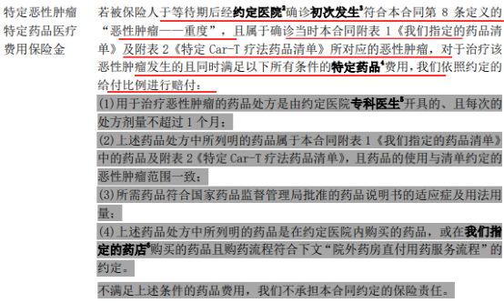 1-被保人经约定医院初次确诊重度恶性肿瘤,且属于指定药品清单及特定Car-T疗法药品清单对应的癌症,产生的满足条件的特定药品费用按约定比例报销;