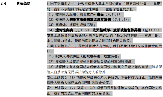 3-下面是这款产品的身故免责,与一般的重疾身故免责相比,还是比较少的:
