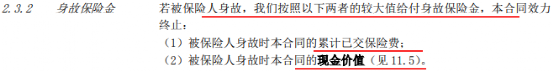 1-被保人身故,赔付已交保费或现金价值二者较大值;