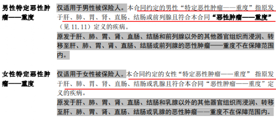 2-特定恶性肿瘤指原发于肝、肺、胃、肾、直肠、结肠或前列腺的重度恶性肿瘤,仅限男性;或指原发于肝、肺、胃、肾、直肠、结肠或乳腺的重度恶性肿瘤,仅限女性: