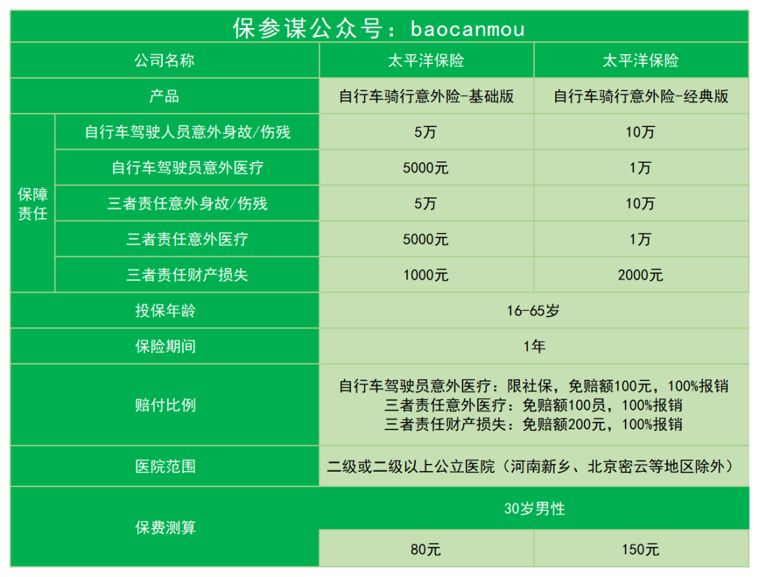 点评:这款产品有两个方案供选择,涵盖了自行车驾驶员意外身故伤残、意外医疗以及三者意外身故伤残、意外医疗和财产损失。
