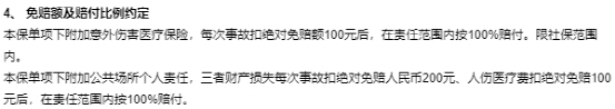 2-三者财产损失免赔额200元,人伤医疗免赔额100元,责任范围内扣除免赔额按100%报销。