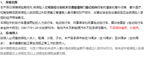 太平洋自行车(含电动)骑行意外险:不承保快递员、外卖员