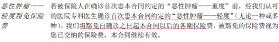 点评:被保人符合轻度恶性肿瘤的赔付条件,赔付了轻度恶性肿瘤保险金后,豁免后续保费。