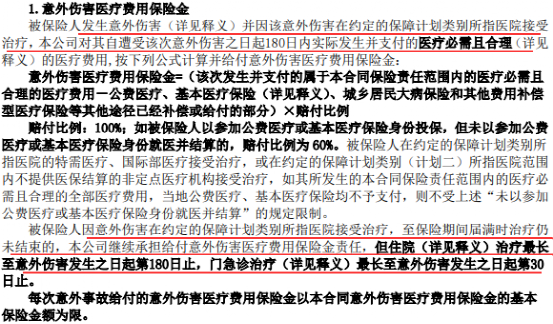 1-被保人因遭受意外伤害,且在180天内因该意外产生治疗的,对产生的医疗费用按约定比例报销;