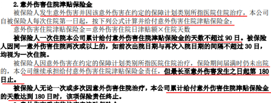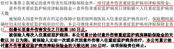 2-意外重症监护病房津贴单次给付最高30天,累计给付180天。