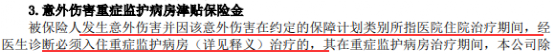 1-被保人因遭受意外伤害,并因该意外在指定医院住院治疗,经医生诊断必须入住重症监护病房的,给付意外伤害重症监护病房津贴;