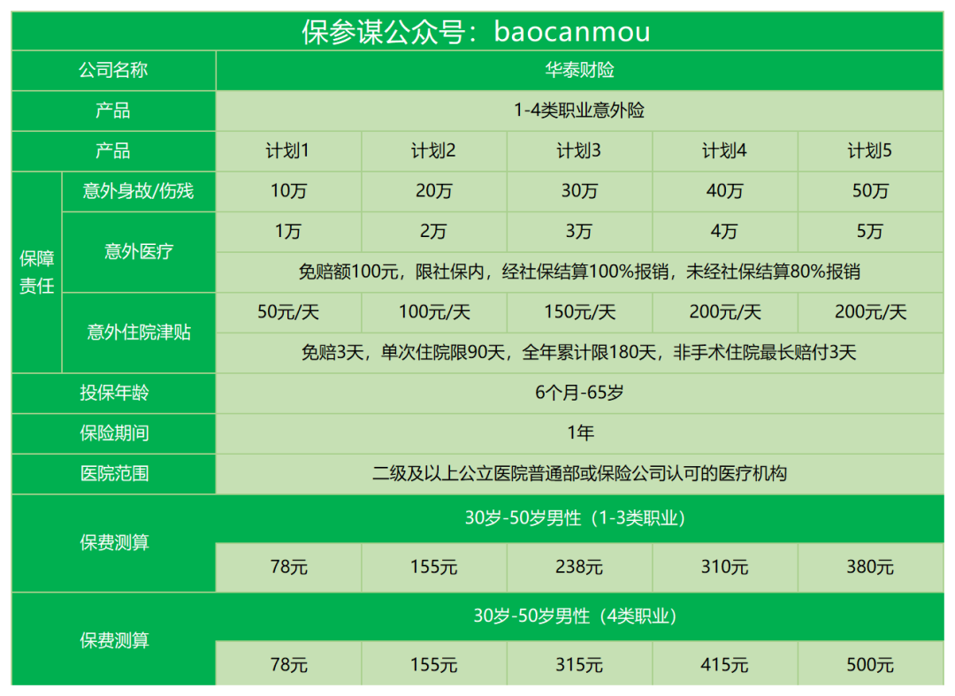 华泰1-4类职业可投保:共计5个保障计划的意外险