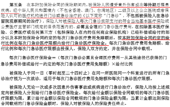 1-被保人因意外伤害或等待期后因疾病进行门急诊治疗的,产生的医疗费用扣除免赔额后,按约定比例报销;