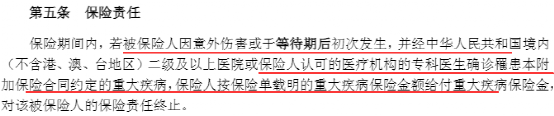 点评:被保人因意外或等待期后初次罹患重大疾病,按约定的重疾保险金金额给付重疾保险金。