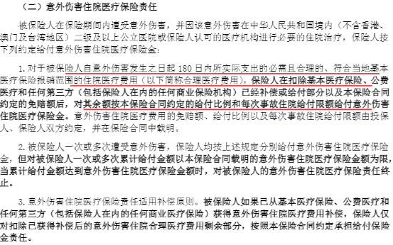 1-被保人因遭受意外伤害而接受住院治疗的,对自意外发生之日起180天内产生的住院医疗费用扣除免赔额后,按约定比例报销;