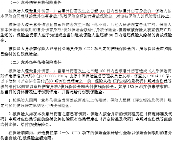 1-被保人因意外伤害事故,且在180天内导致身故/伤残,可赔付意外保险金;