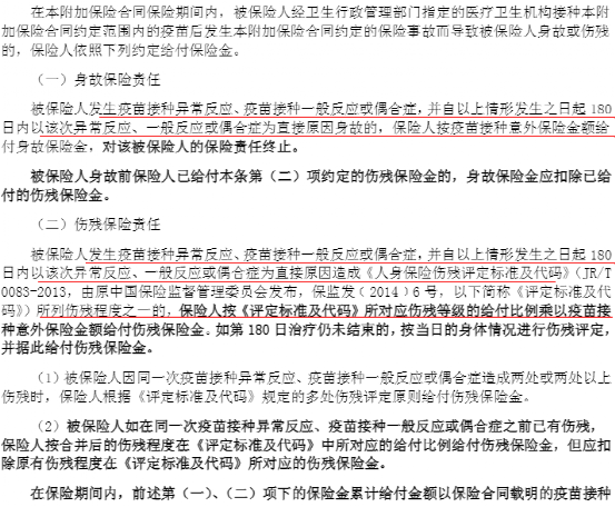 1-被保人因发生疫苗接种异常反应、疫苗接种一般反应或偶合症,且在180天内因上述异常导致身故/伤残,可赔付意外保险金;