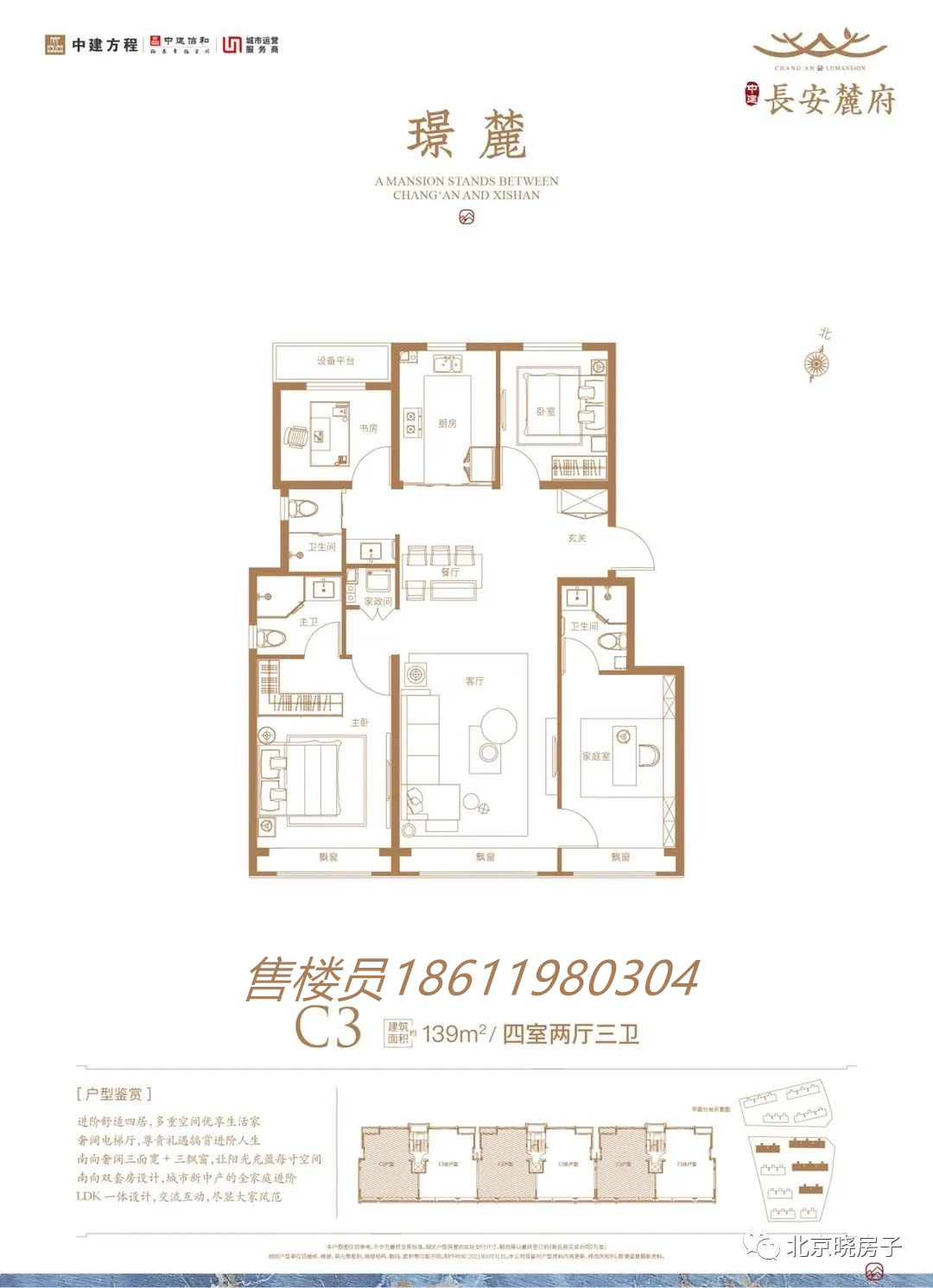 139平四室两厅三卫,这个户型和115的类似,只是南向次卧多了一个卫生间,主卧多了一个衣帽间,整体会稍微大上一圈。139平米 806万-837万