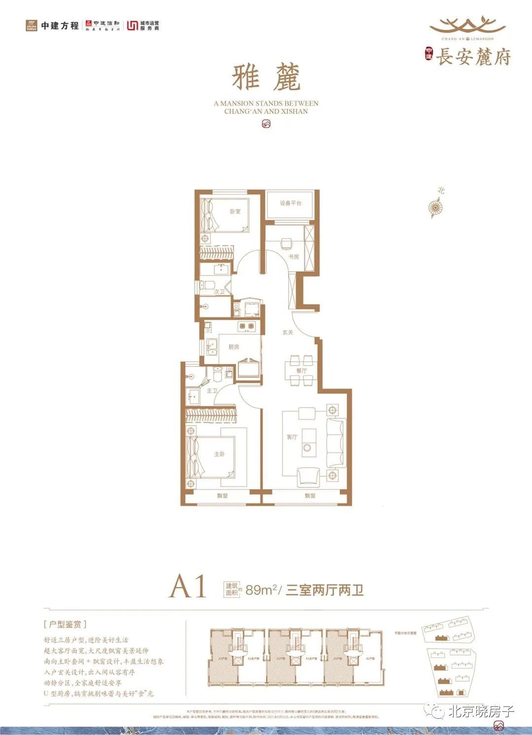 89平三居两卫,也是最近两年市面上出现比较多的户型,南北通透全明格局,南侧客厅加客厅,北侧两个小卧室,其中一个卧室北侧有一个设备平台的赠送,这也是得房率这么高的原因。89平米 470-535万