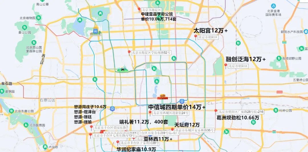 三环外的丰台分钟寺板块,世茂北京天誉1800万/套起,东叁金茂府均价11.3万/平,合生缦云2500万/套起。