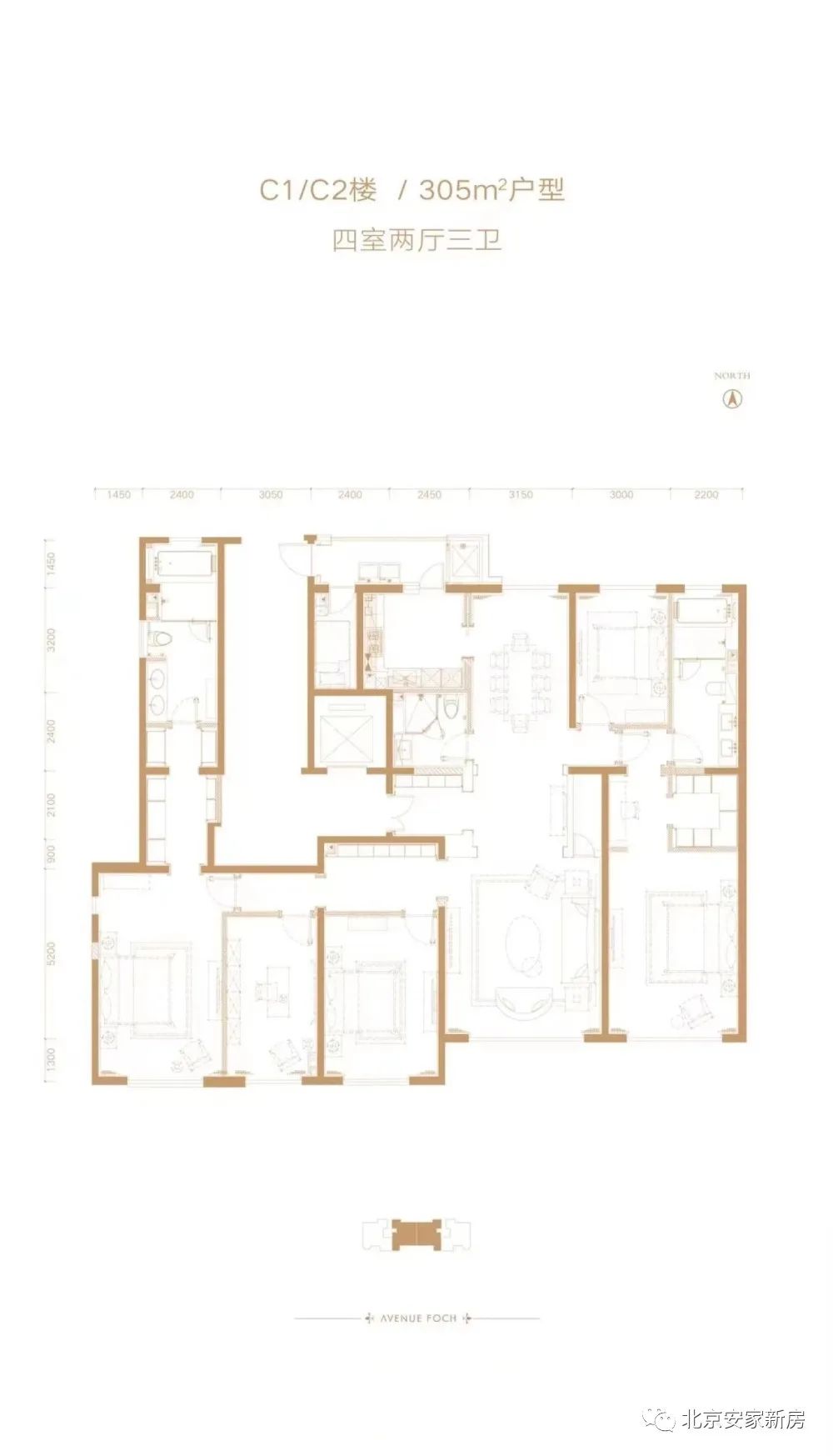 305平四室两厅三卫:南、北朝向,4室2厅3卫,3300万/套,分布于楼栋C1号楼(现11号楼)。