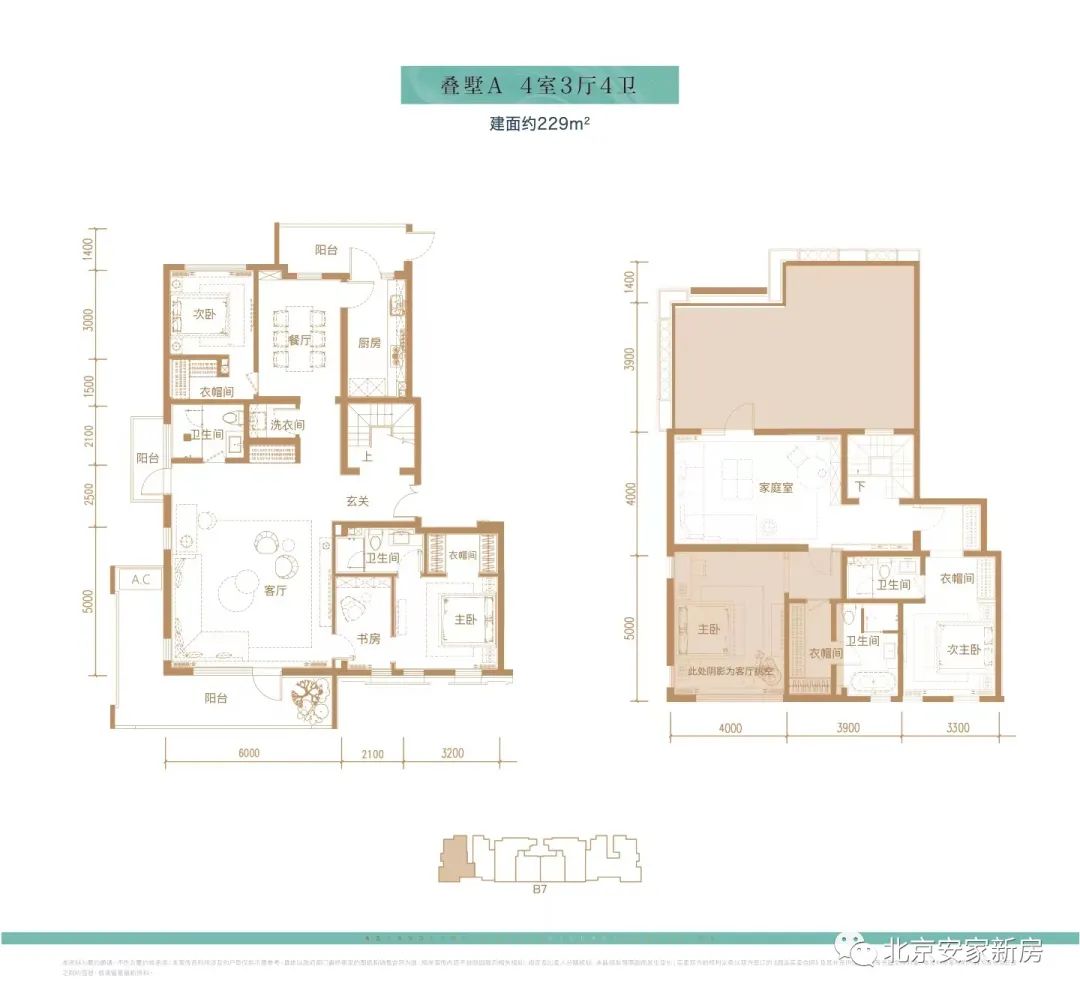 叠墅A户型229平:南、北朝向,4室3厅4卫,2913万/套,分布于楼栋B8(6号楼)。