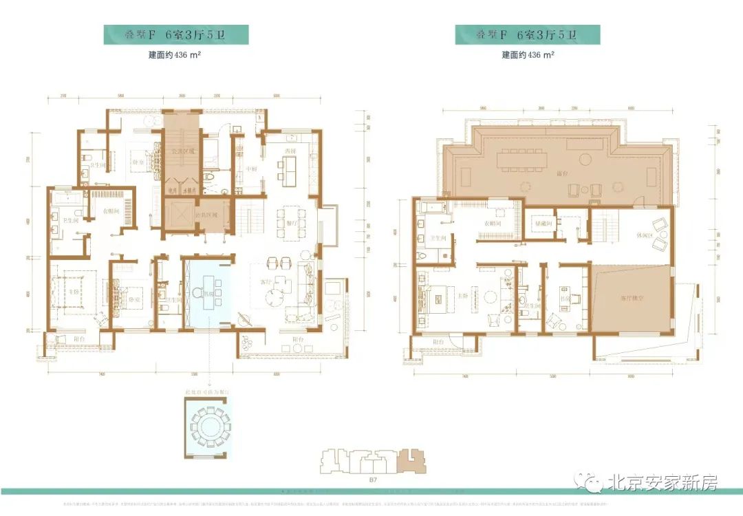 叠墅F户型436平:南、北朝向,6室3厅5卫,4571万/套,分布于楼栋B7(15号楼)。